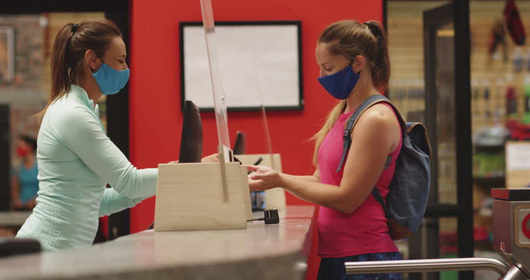 - Caucasian Women Practicing Safety at Gym Reception During Pandemic