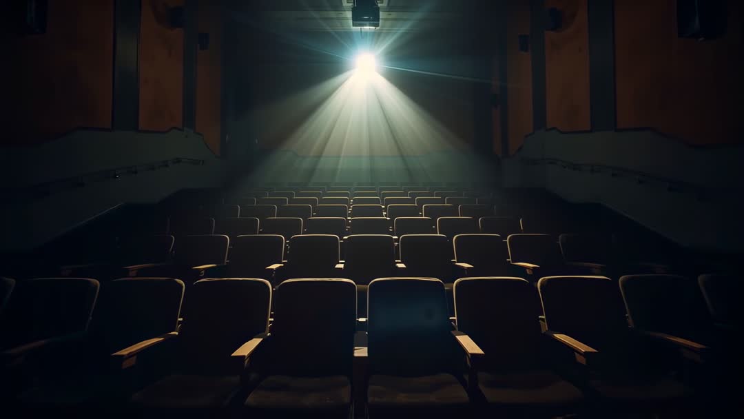AI Generated Video. Projector casting focused beam across empty cinema auditorium, illuminating rows of vintage seats and producing visible rays through haze and floating dust. Camera perspective facing screen from rear rows, capturing symmetrical seat lines and balcony silhouettes while light creates warm edge highlights and deep cool shadows. Lighting mood cinematic and dramatic, offering strong negative space for text or graphic overlays. Use cases: film festival promos, cinema reopening announcements, theater restoration campaigns, streaming platform headers, cinematic title sequences, lighting design portfolios, editorial pieces about cinema culture and nostalgia. Technical notes: high contrast composition works well with teal-and-amber color grading, grain or film emulation for vintage feel, clip looping for ambient background use. Perfect for trailers, social media posts, website hero banners, event invitations, or behind-the-scenes sequences about projection and exhibition.