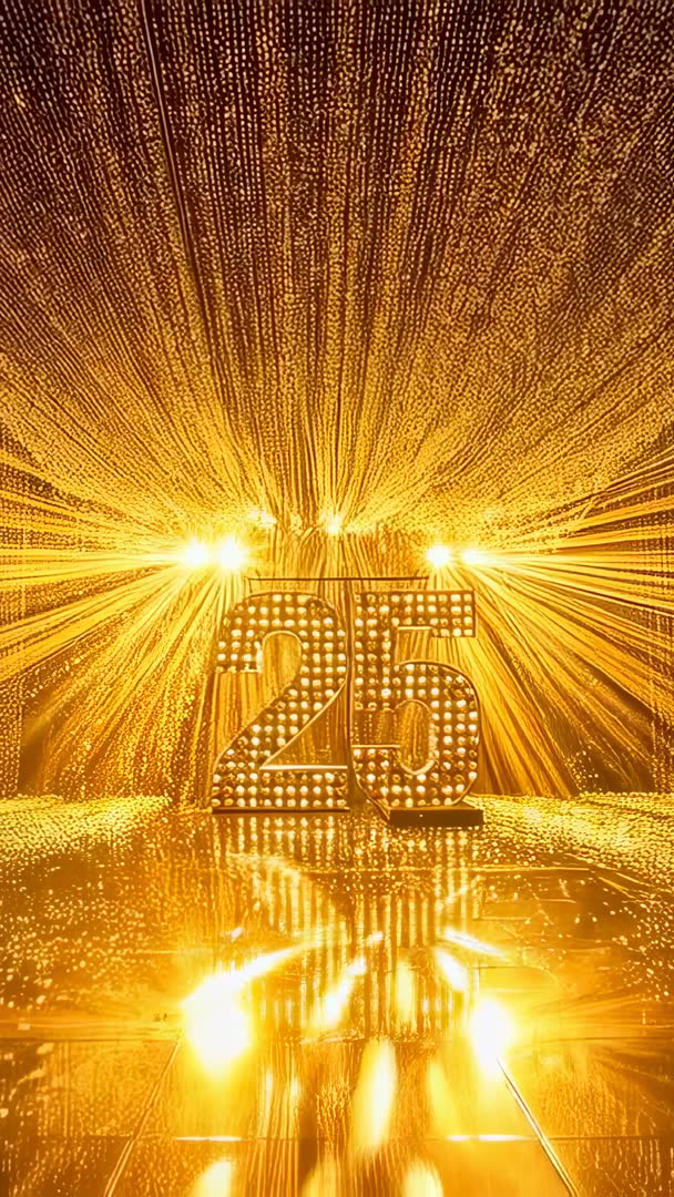 AI Generated Video. Radiating golden canopy of lights framing illuminated bulb-marquee numeral 25 and creating dramatic beams, glittering bokeh, and mirror-like reflections on glossy floor. High-contrast stage lighting producing warm, celebratory mood and strong focal point on numeric marquee. Ideal for anniversary celebration videos, milestone promos, gala openers, award show intros, event highlight reels, luxury brand campaigns, and product launch teasers. Vertical format optimized for social stories, reels, and mobile ads. Editing suggestions: pairing with slow-motion clips or subtle time-lapse to emphasize shimmer; adding soft vignette and warm color grading to enrich gold tones; placing logo or text overlay near bottom or center for impactful reveal. Licensing recommendations: use for event marketing, website hero backgrounds, social media campaigns, invitation videos, and TV promotional spots.