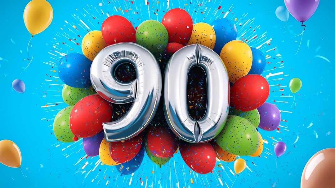 AI Generated Image. Video frame featuring silver foil number 90 balloons bursting confetti and vibrant latex balloon cluster on bright cyan background. High-energy composition and vivid color palette creating bold central focal point for milestone celebrations. Use for 90th birthday promotions, 90th anniversary campaigns, social media reels, email headers, website banners, event openers, party supply advertising, greeting animations, and TV spots. Place text overlay or animated logo near top or bottom while keeping number balloons central to preserve visual impact. Works well with upbeat music, slow-motion confetti reveal, or looping GIF for continuous celebration effect. High contrast and clean silhouette making easy for compositing, color grading, and inclusion in motion graphics templates or broadcast intros.
