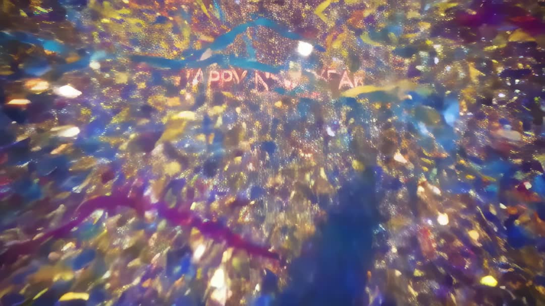 AI Generated Video. Clip showing confetti cannon launching multicolor confetti, streamers and glitter while revealing HAPPY NEW YEAR 2026 text against dramatic stage lighting. Camera panning and shallow focus creating immersive burst effect with sparkling highlights and motion blur. Using for New Year event promos, countdown reels, social media clips, TV broadcast intros, event openers and party highlight videos. Editing suggestions: slowing footage for dramatic reveal, adding celebratory sound effects and upbeat music, overlaying logo and text for branding, looping for livestream background. Styling tips: boosting warm highlights, enhancing sparkle with glow filters, matching color grade to event palette. Ideal for marketing campaigns, event production, venue promotion and festive advertising.