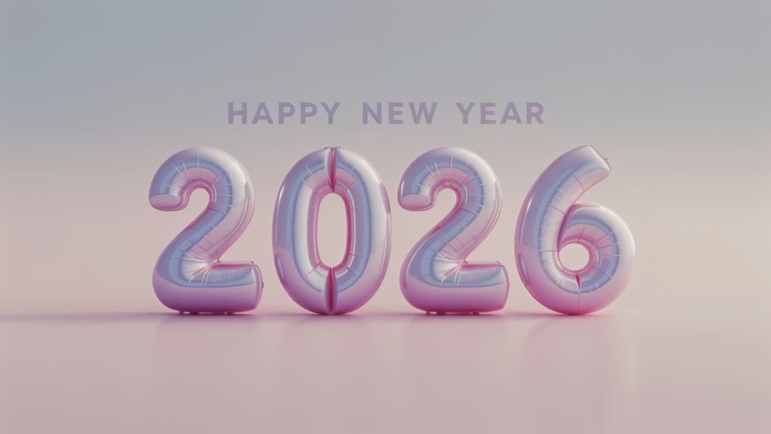 AI Generated Video. Featuring metallic pastel foil balloons forming 2026 with soft gradient lighting and glossy floor reflection. Serving as New Year countdown visual for social media reels, Instagram stories, TikTok clips, and YouTube intros. Working well for event promotions, retail campaigns, email headers, website banners, and digital greeting cards. Offering clean minimal composition and calm pink-blue palette for modern branding and lifestyle projects. Including loopable short clip and still-frame extraction for print and online use. Allowing easy overlaying of logos or text and color grading for seasonal campaigns. Labeling as AI-generated content for transparency where required.