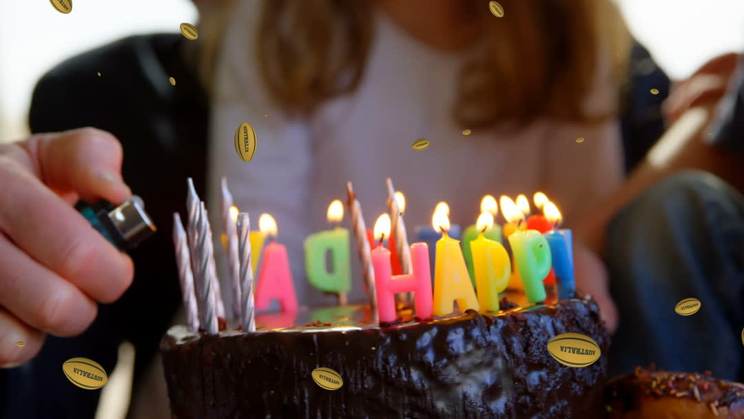 This setup captures a festive moment with colorful birthday candles being lit on a chocolate frosted cake. The vibrant colors add to the joyful ambiance, complemented by whimsical animations of falling objects. This visual theme is effective for birthday and celebration promotions, party invitations, children's events, or social media posts evoking a lively and fun-loving atmosphere.