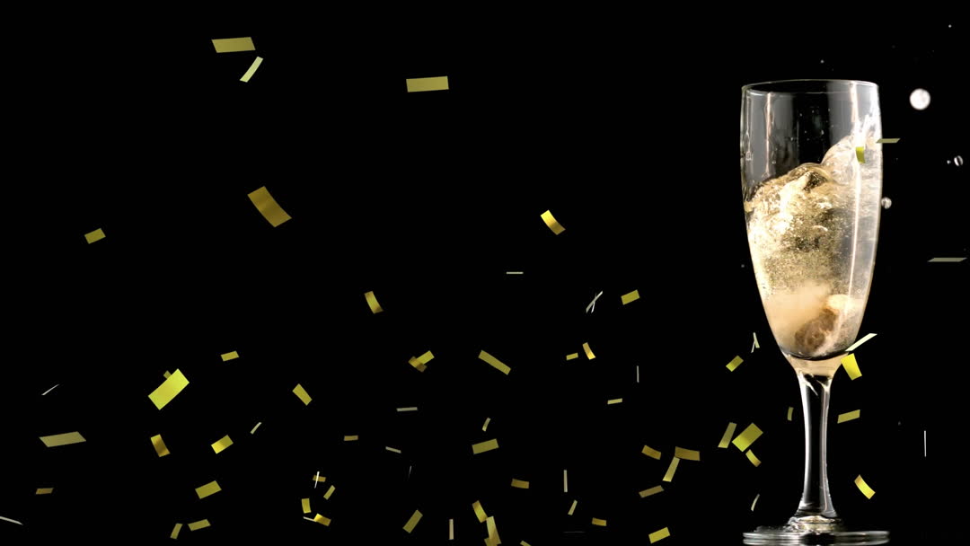 Single glass of champagne with large ice cube, surrounded by gold confetti in motion against black backdrop. Perfect for illustrating life’s joyful celebrations and special occasions, suitable for party invitations, festive promotions, or lifestyle videory.
