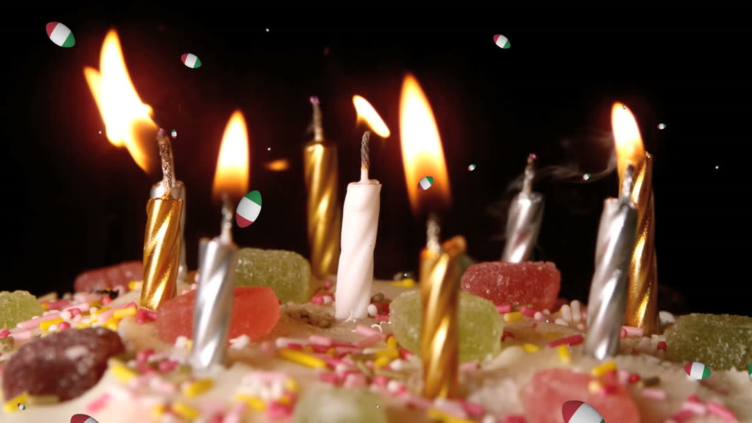 A lively and colorful animation showcasing a birthday cake with several candles flickering against a dark background. Sprinkles and vibrantly colored candies adorn the cake. Italian flag elements add cultural flair, ideal for social media sharing, festive blog posts or cultural celebration promotions.