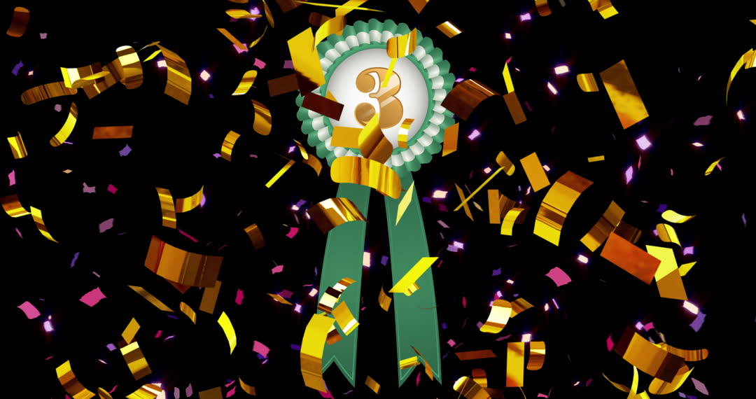 The video depicts a green and white rosette with the number three, symbolizing a third-place award, amidst falling gold confetti against a black background. This can be used for celebrating achievements, illustrating success in competitions, or as a backdrop for events related to awards and honors. Suitable for acknowledging accomplishments and motivational themes.