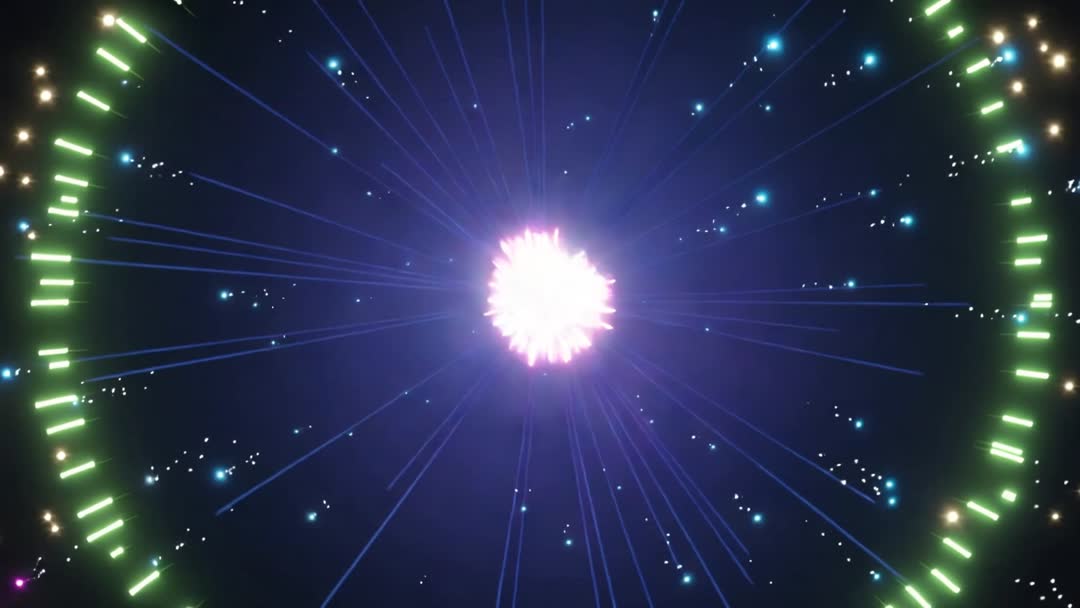 AI Generated Image. Loopable 10-second clip featuring glowing central core bursting, sending radial neon streaks and forming pulsing particle rings across cosmic void. HD 16:9 composition providing center-focused motion and strong symmetry for easy cropping and title placement. Color palette combining electric blue, violet, neon green, creating high-contrast cinematic look suitable for tech and entertainment projects. Usage ideas: enhancing electronic music visualizers and VJ sets, powering sci-fi trailer opens and broadcast intros, complementing tech product promos and app demos, serving as looping background for event screens and social media stories, supporting educational visuals about astronomy or particle physics. Editing tips: applying color grading and speed ramping, overlaying typography or logo reveals, using additive blending for layered light effects, isolating central core for particle simulations.