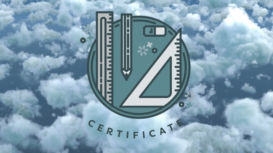 Animation featuring certificate-themed geometric icons like rulers and pencils shown over fluffy clouds, implying creativity and achievement. This can be used for backgrounds in educational content, digital certificates, inspirational design elements, or online courses.