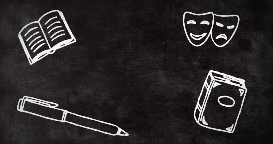 Chalkboard feeling with school-related doodles including an open book, pen, theater masks, and closed book. Suitable for educational materials, classroom resources, school promotions, or creative learning concepts. Copy space allows customization for messages or headers.