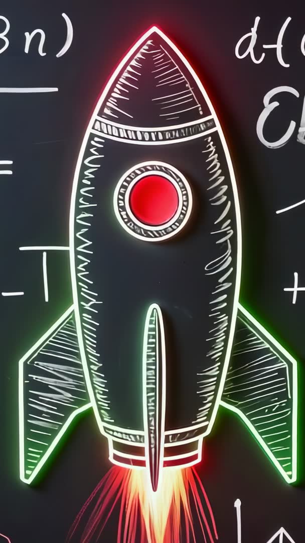 AI Generated Video. Showing chalkboard rocket sketch launching upward with neon outlines and bright fiery exhaust in vertical aspect ratio. Featuring hand-drawn strokes, glowing edge highlights, and animated flame trails ideal for STEM and tech content. Suited for social media stories, reels, TikTok, mobile ads, product launch teasers, educational explainer videos, classroom lesson intros, startup pitch decks, and website hero loops. Offering loopable motion, dark matte background for overlaying text and icons, and easy color grading for brand alignment. Helping convey innovation, growth, ambition, and basic physics or engineering concepts. Suggesting usage ideas: add title cards and voiceover, overlay quick facts or bullet points, use as background for logo reveal, integrate into curriculum modules for rocket science lessons, or include in promotional reels for tech programs and science camps.