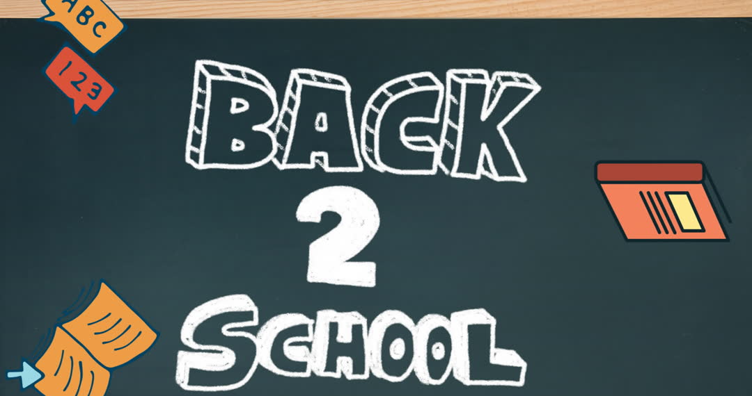 Chalkboard background features playful 'Back 2 School' animated text alongside whimsical school icons such as books and pencils. Perfect for educational content, school announcements, digital marketing for learning initiatives, and welcoming students back ideas.