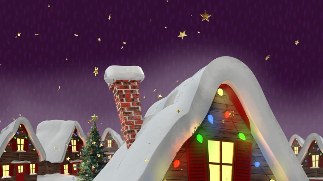 - Charming Snowy Village Roofs with Festive Lights and Falling Stars