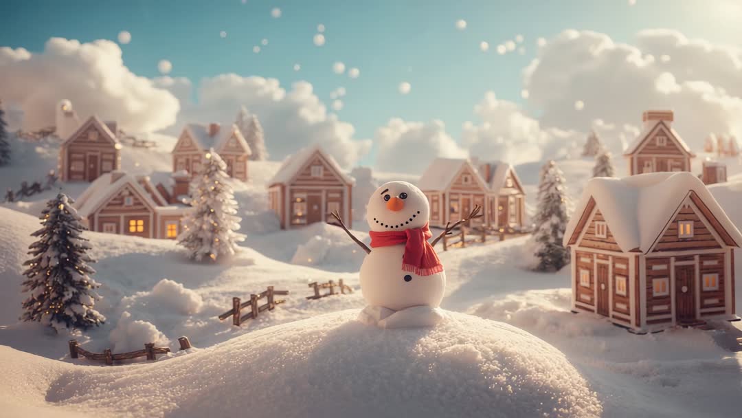 Charming Winter Snowman Welcoming Wonder in Festive Village Video
