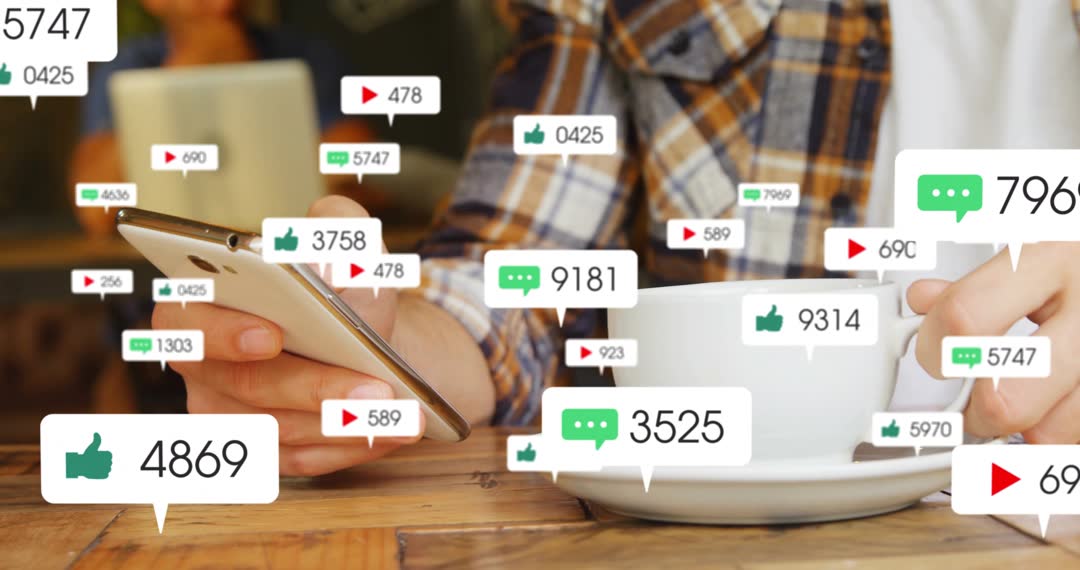 Short video clip showing hands holding smartphone and tapping while social notification bubbles multiply above wooden table and coffee cup. Overlaying like icons, comment bubbles, play buttons and view counts creating dynamic visual of rising engagement. Useful for social media marketing, app demo, influencer campaign, digital ads, UX presentation, tutorial and blog header. Use for illustrating concepts such as viral content, audience growth, real-time engagement, notification overload and mobile interaction. Provide options for looping background for website hero, intro clip for marketing video or slide visual for business presentation. Color palette featuring warm cafe tones and bright notification badges. Duration useful for short form content and multiplatform campaigns. Include room for text overlay and logo placement in blurred background areas.