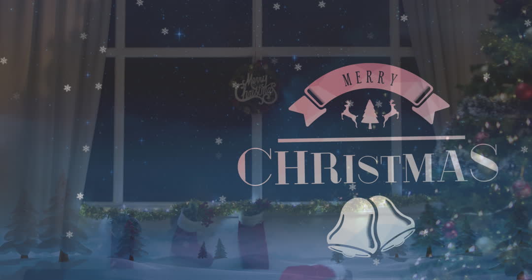 Vibrant animation depicting Christmas greetings amid snowflakes and holiday decor. Ideal for festive invitations, social media posts, and e-cards celebrating the joyous season. Features merry Christmas text with bells and reindeer, creating a warm holiday atmosphere. Perfect for engaging audiences with seasonal cheer.