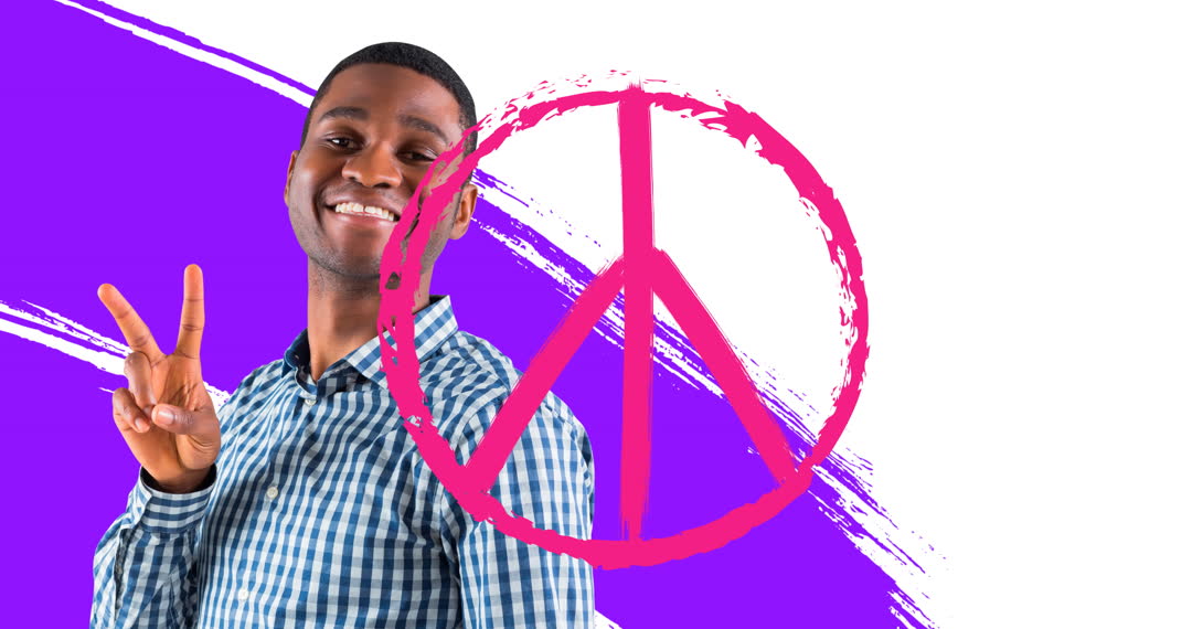 Man is expressing joy while showing a peace sign beside a peace symbol against colorful brush strokes. This can be used for promoting peace-themed events, wellness campaigns, or social positivity initiatives, especially on international peace days.