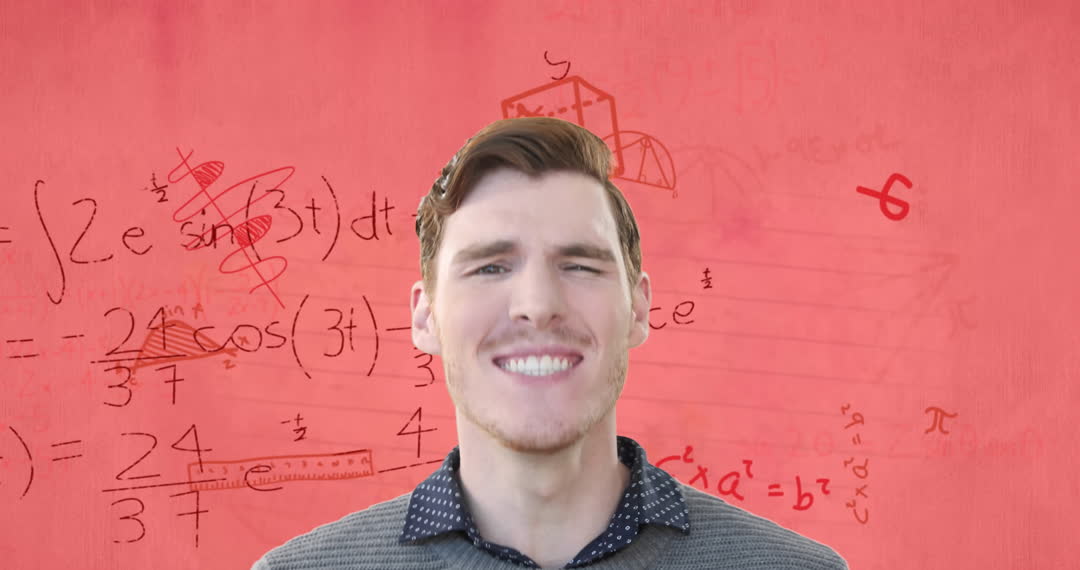 Smiling male student surrounded by mathematical equations and geometry concepts on a pink background symbolizes enjoyment in academic pursuits. Useful for educational content, math tutorials, or promotional material for schools and tutoring services.