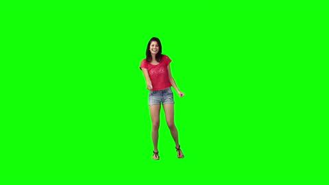 Woman is seen dancing joyfully in casual summer clothing against a vibrant green screen. Usable for projects focusing on themes like positivity, freedom, joy, happiness, youth culture, or as a chroma key placeholder for creative background replacements.
