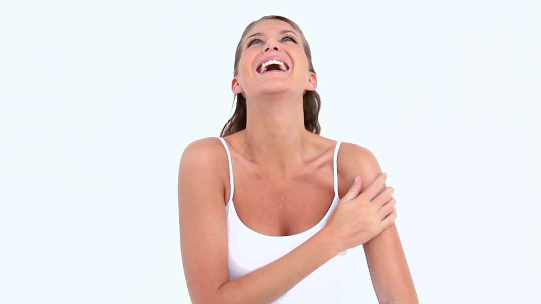 Woman enjoying her skincare routine, moisturizing her arm with joy and laughter against a minimalist white background. Perfect for wellness, beauty, and self-care advertisements or blog features exploring happiness and skincare routines.