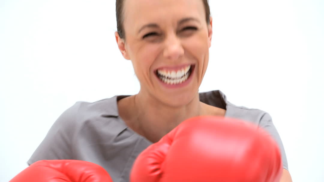 - Cheerful Woman with Boxing Gloves Laughing Playfully