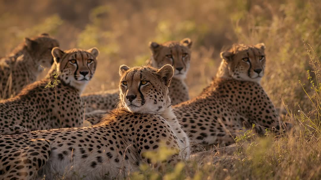 AI Generated Video. A group of cheetahs resting amidst grassland as golden sunlight bathes them in warmth. Perfect source for exploring themes of wildlife conservation, natural beauty, animal behavior, and collaborative instincts among big cats.