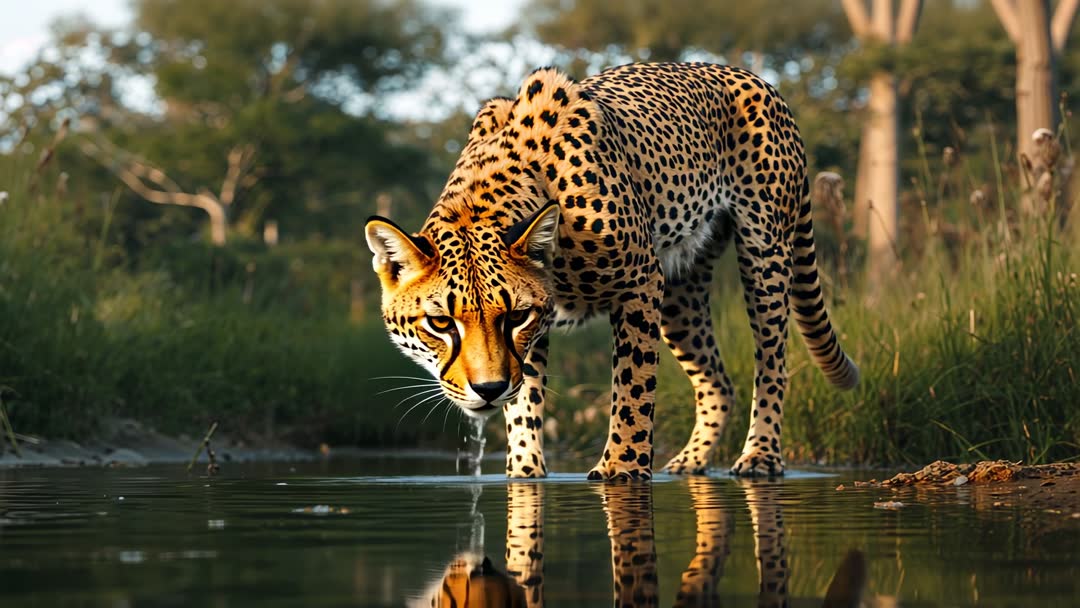 AI Generated Image. Video shows a majestic cheetah stepping out of tall grasses to drink from a pool in the sunlit savannah. The scene highlights the elegance and vitality of wildlife in its natural habitat, emphasizing the beauty of African landscapes. This footage suits wildlife documentaries, nature education features, and digital content promoting environmental awareness and conservation efforts.