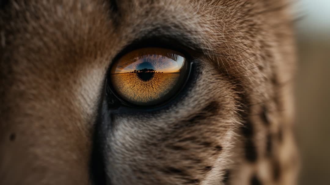 AI Generated Video. This close-up view of a cheetah's eye is emphasizing the vivid reflection of a sunset on the savannah. The golden hour lighting highlights the details and brings into focus the intricate patterns within the eye. Ideal for wildlife documentaries, educational materials on predators, artistic projects, or ambient display efforts seeking to capture the beauty and mystery of nature. It establishes a deep connection with the observer, portraying both the quiet power of predators and the serene environment surrounding them.