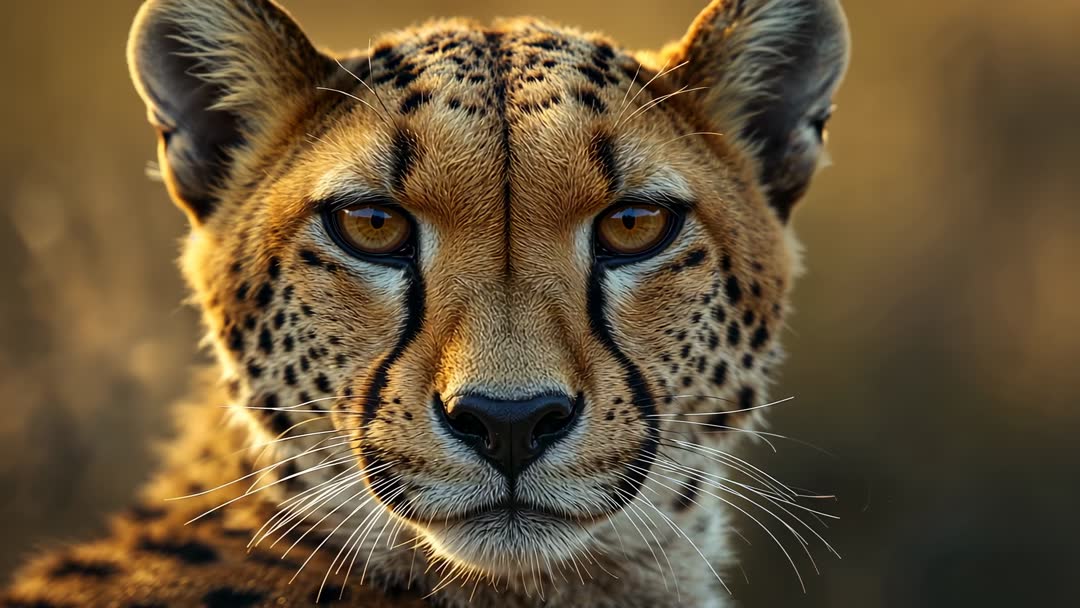 AI Generated Video. A captivating close-up of a cheetah with piercing eyes, surrounded by the warm glow of the savannah. Its focused gaze, coupled with slight blinking and whisker twitching, showcases its keen awareness and elegance. Ideal for use in wildlife documentaries, educational materials, or websites focusing on nature conservation and the beauty of endangered species.