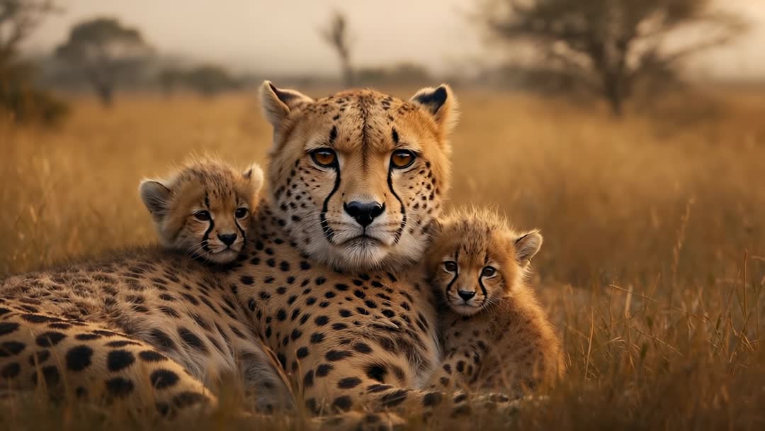 - Cheetah with Cubs on Sunset Savannah