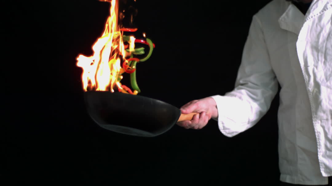 - Chef Flipping Sizzling Peppers in Fiery Stir Fry