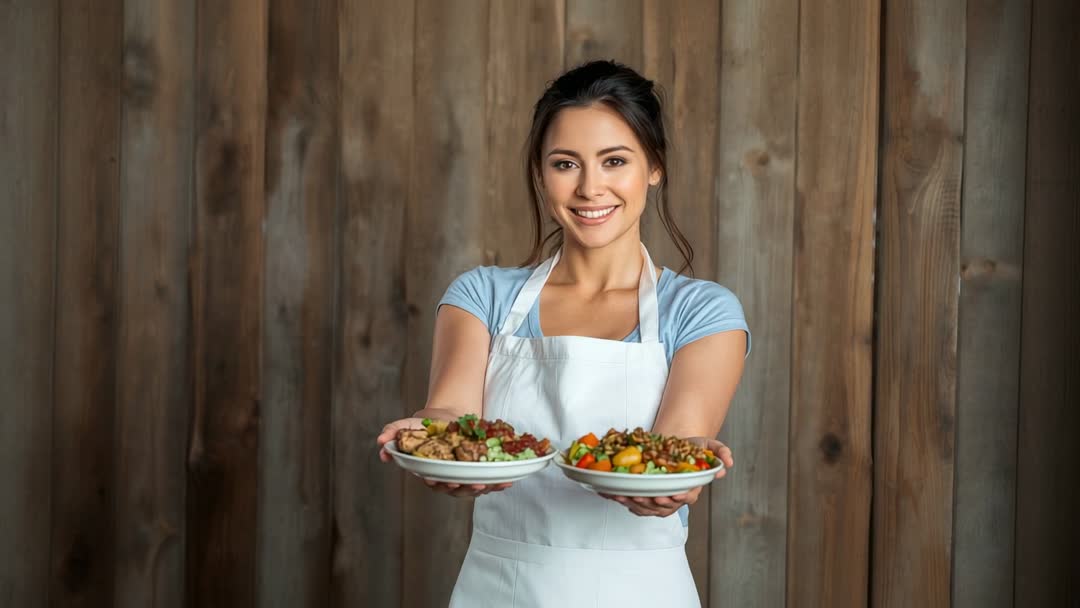 AI Generated Image. A chef stands proudly holding two beautifully arranged dishes, set against a rustic wooden wall. The homestyle cooking and harmonious display suggest a fusion of traditional and modern culinary techniques. This visual could be used for promoting cookbooks, recipe websites, culinary classes, or restaurant branding, emphasizing the skill and artistry in meal preparation.
