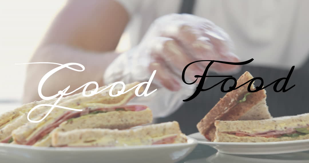 Chef skillfully arranges fresh sandwiches on plates, showcasing culinary art. Great for content focusing on gourmet food, home cooking, kitchen tutorials, and restaurant promotions.