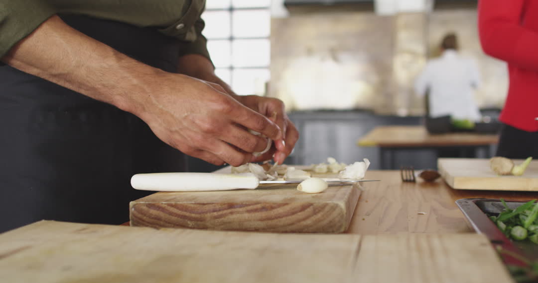 Chef skillfully prepares ingredients on a chopping board using knife skills in a modern kitchen environment. Suitable for use in articles or advertisements on culinary arts, professional cooking, or cooking classes. Highlights the expertise and precision required in professional kitchens.