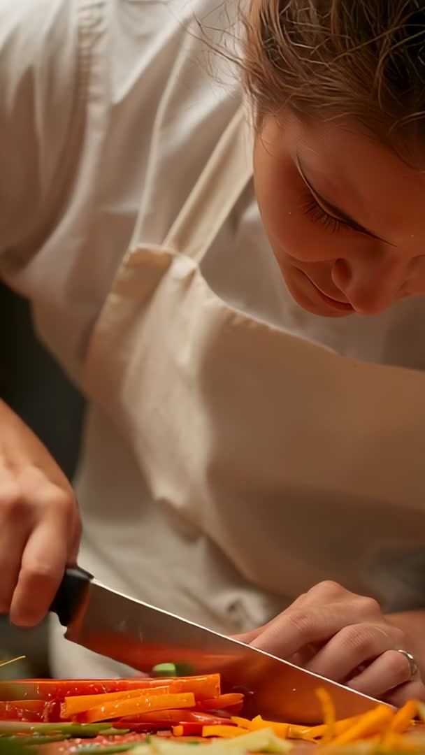 AI Generated Video. Showing chef leaning over cutting board, slicing carrots and bell peppers into thin julienne strips using precise knife technique. Close-up framing capturing hands, blade edge, colorful vegetable strips, and warm kitchen light, conveying focus and craftsmanship. Video working well for cooking tutorials, step-by-step recipe shorts, social media reels, and culinary school demonstrations. Ideal for marketing kitchen tools, restaurant promo clips, meal kit ads, and food styling portfolios. Pairing with upbeat music, adding text overlays for instruction, and looping short segments for Instagram Reels or TikTok are recommended.