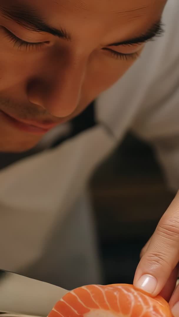 AI Generated Video. Close-up showing chef leaning over cutting board, slicing salmon fillet into thin sashimi pieces with steady hand and focused expression. Warm lighting highlighting flesh texture and delicate knife strokes, evoking calm, meticulous craftsmanship. Vertical framing capturing face and hands, creating intimate mobile-friendly composition for short-form video platforms. Footage working well for cooking tutorial intros, restaurant social media posts, menu video loops, culinary school demonstrations, chef portfolio reels, and food styling reels. Color palette and minimalist composition allowing easy overlay of text, logo, or recipe steps. Recommend using 9:16 aspect ratio, adding subtle music and ambient kitchen sound, and pairing with step captions for engaging recipe content.