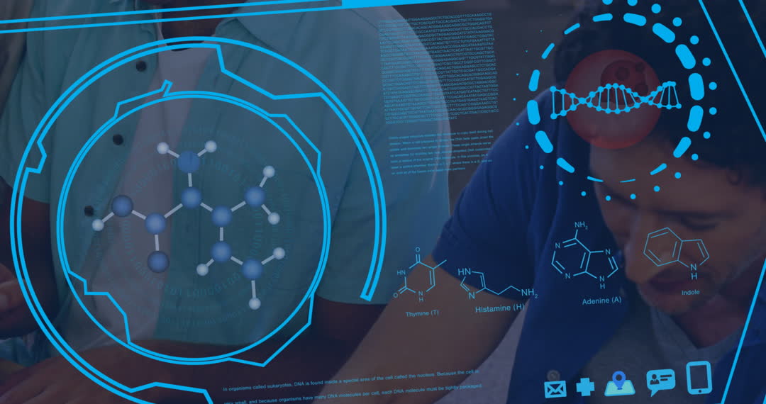 Illustration depicts chemical formula animations and digital data overlays in technological setting with diverse individuals collaborating using laptop. Perfect for educational content on scientific innovation, presentations on digital technology, or promotional materials related to teamwork and diversity in tech fields.
