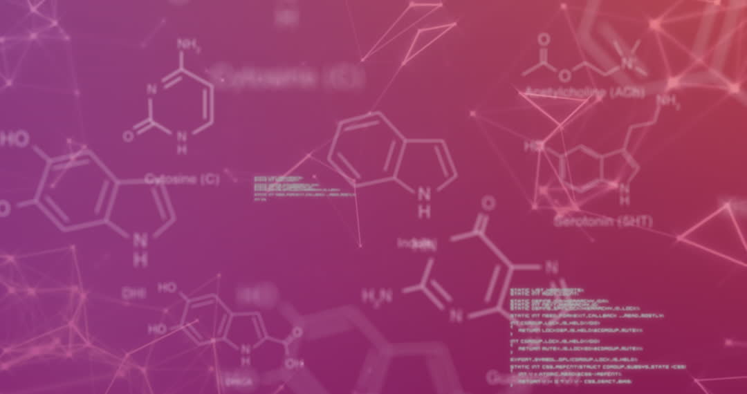 Complex depiction of chemical formulas intertwined with digital data and network connections against a purple background. Image useful for educational content in chemistry and technology sectors, digital-focused presentations, science-themed websites, and innovative tech illustrations.