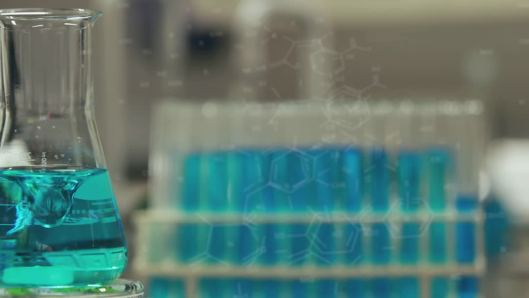 Animation depicts chemical formulas overlaying a laboratory scene with a beaker filled with blue liquid. Ideal for educational videos and presentations related to chemistry, pharmaceuticals, and scientific research. Captures an essence of innovation and discovery in a lab environment.