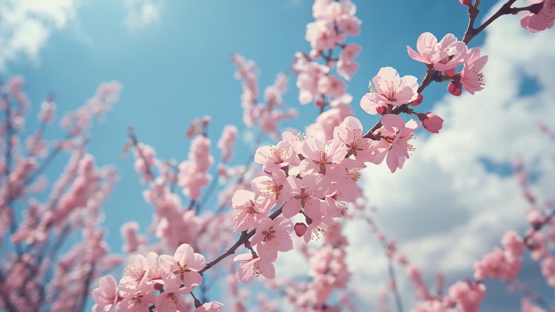 AI Generated Video. A peaceful scene of pink cherry blossoms swaying gently in the breeze against a clear blue sky with fluffy clouds. Useful for videos focused on nature, meditation backgrounds, or fabric textile designs evoking springtime and renewal.