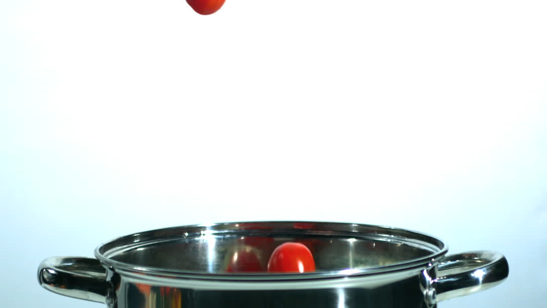 - Cherry Tomatoes Falling Elegantly Into Stainless Steel Pot in Slow Motion