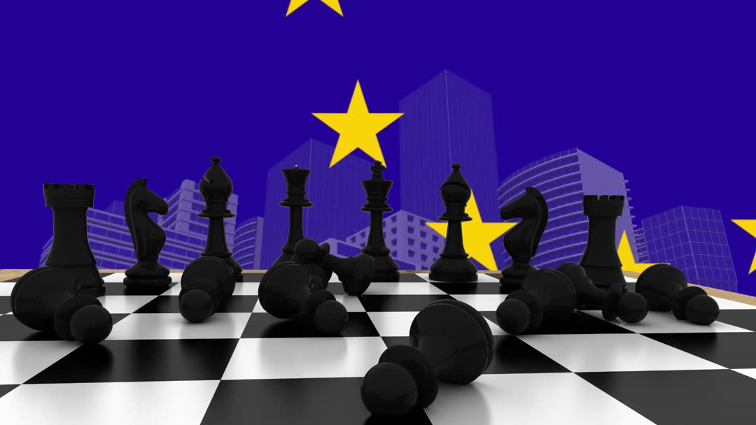 Illustration shows chess pieces on a chessboard with an urban skyline and European Union flag in the background. Image symbolizes strategy, competition, and political maneuvering. Use for projects related to geopolitics, European culture, business strategy, or educational materials on competitive tactics.