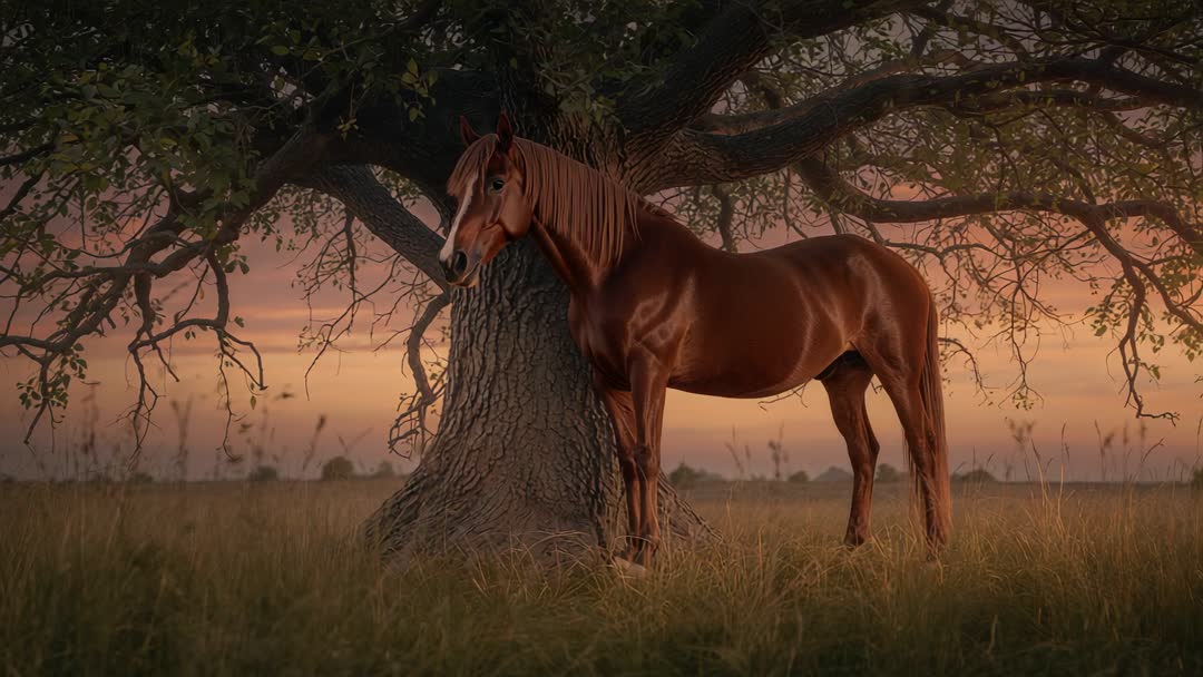 AI Generated Video. This video frame captures a graceful chestnut horse standing still beside a large oak tree under a colorful sunset sky in an open pasture. Perfect for projects focusing on nature's beauty, equestrian themes, or rural settings, this peaceful scene can enhance content related to veterinary care, outdoor activities, or wildlife conservation.