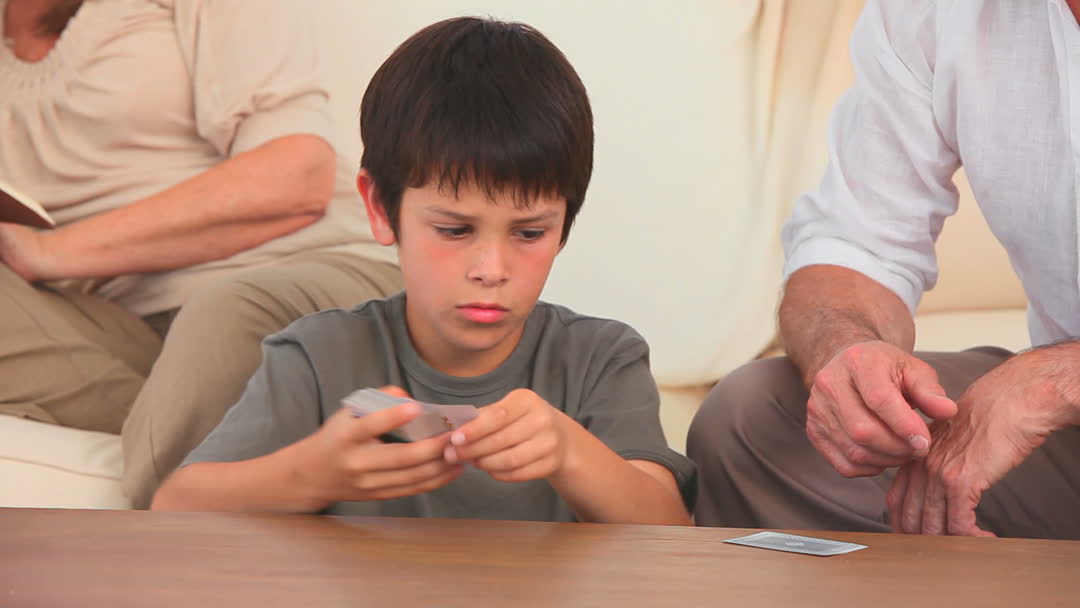 Boy concentrating while playing cards adds aware atmosphere. Features intergenerational bonding, leisure, family interaction. Suitable for parenting articles, family lifestyle blogs, multimedia projects focused on family dynamics.