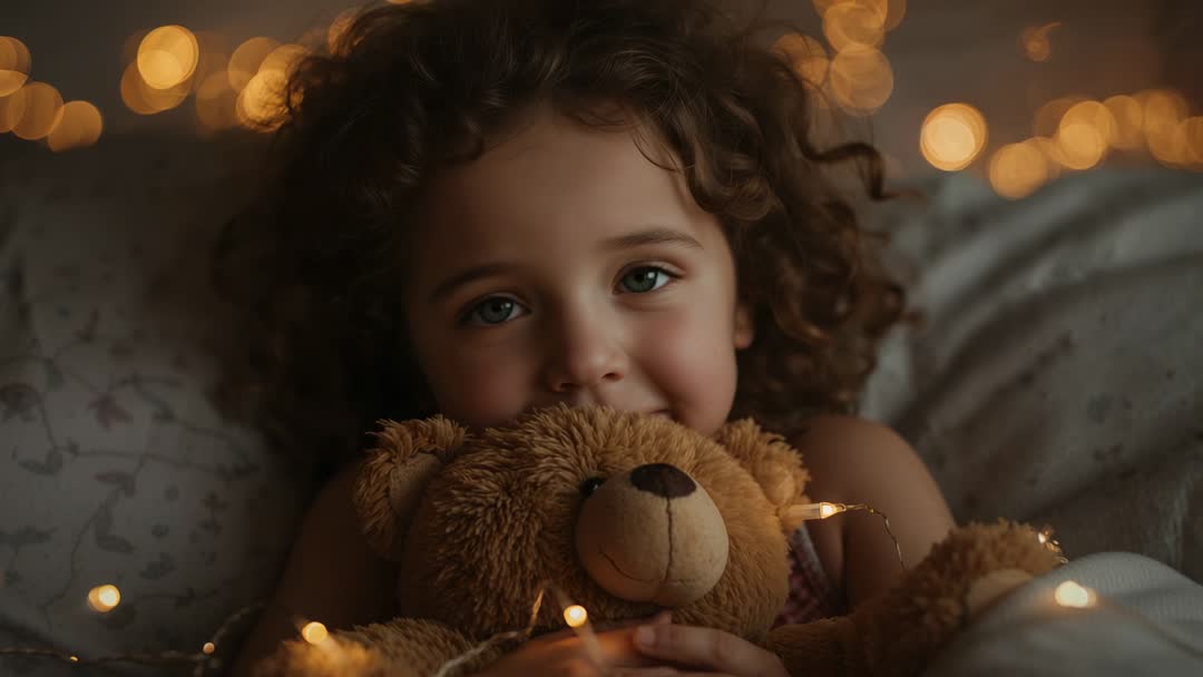 AI Generated Video. Video frame showing child cuddling teddy bear in cozy pajamas while fairy lights glowing in background. Camera focusing on expressive eyes and soft plush textures, creating warm dreamy atmosphere. Scene conveying comfort, security and calming bedtime ritual suitable for family and parenting themes. Use in bedtime routine articles, parenting blogs, sleep product advertising, children's bedding and pajama campaigns, pediatric healthcare materials, lullaby or bedtime story videos, holiday marketing and seasonal social posts. Use close-up crop for hero banners and thumbnails, use wider crop for commercial or lifestyle video, overlay text for headline or call-to-action. Colour grading and soft vignette working well for soothing intimate mood.