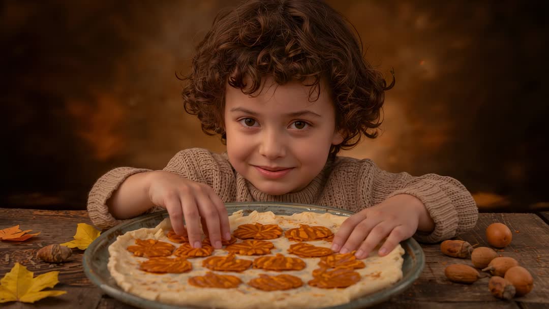 AI Generated Video. Video showing child arranging pumpkin-shaped pastry pieces on pie crust on rustic wooden table surrounded by autumn leaves and nuts. Child wearing tan knit sweater and curly hair smiling toward camera while decorating pie, conveying cozy seasonal mood. Warm golden lighting and wooden textures emphasizing fall atmosphere and homemade baking feel. Ideal for seasonal recipe videos, Thanksgiving and fall holiday campaigns, family lifestyle content, baking class promos, food blogs, cookbook trailers, product packaging for baking supplies. Close-up composition working well for social media reels, banner headers, hero shots, and thumbnails. Color palette featuring warm browns, oranges, creams matching autumn palettes and branding. Consider obtaining model release for commercial use when featuring identifiable child. Use overlay text such as "hands-on fall baking" or "kid-friendly recipes" and pair with recipe copy, step-by-step tutorials, or family memory storytelling.