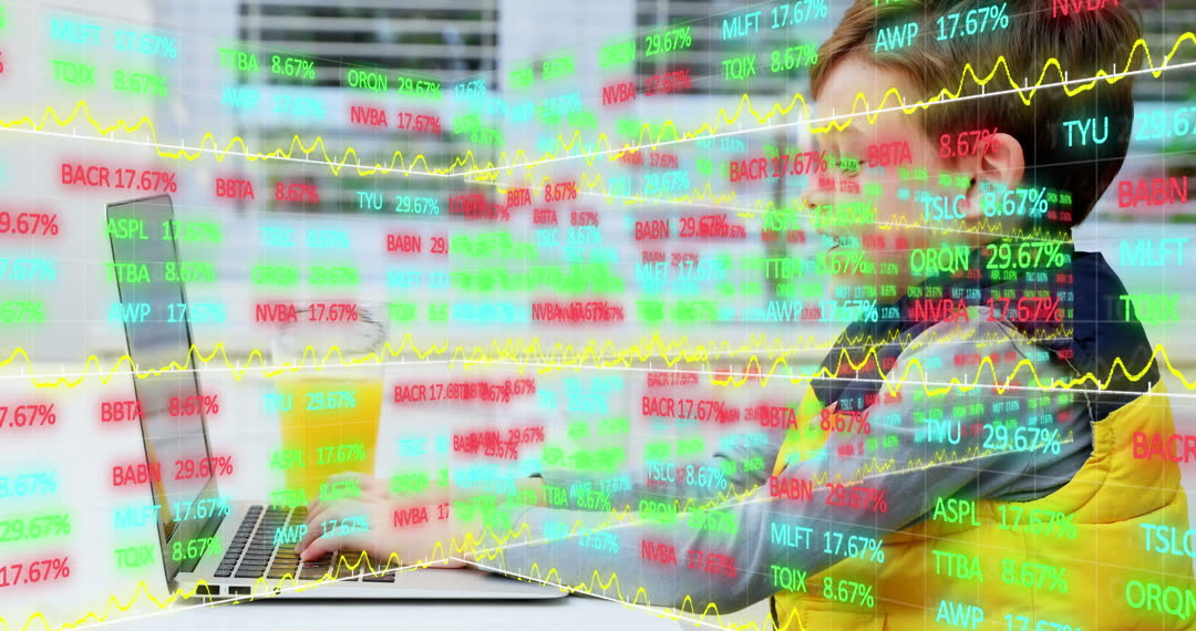 The video shows a child intently engaging with financial data on a laptop, delving into chart illumination displaying various percentages and company codes as a backdrop. This visual signifies technological accessibility and educational interaction with digital finance trends. Perfect for educational articles, technology platforms focused on early financial literacy, or digital learning innovations that emphasize a modern approach to youth and technology-driven understanding.