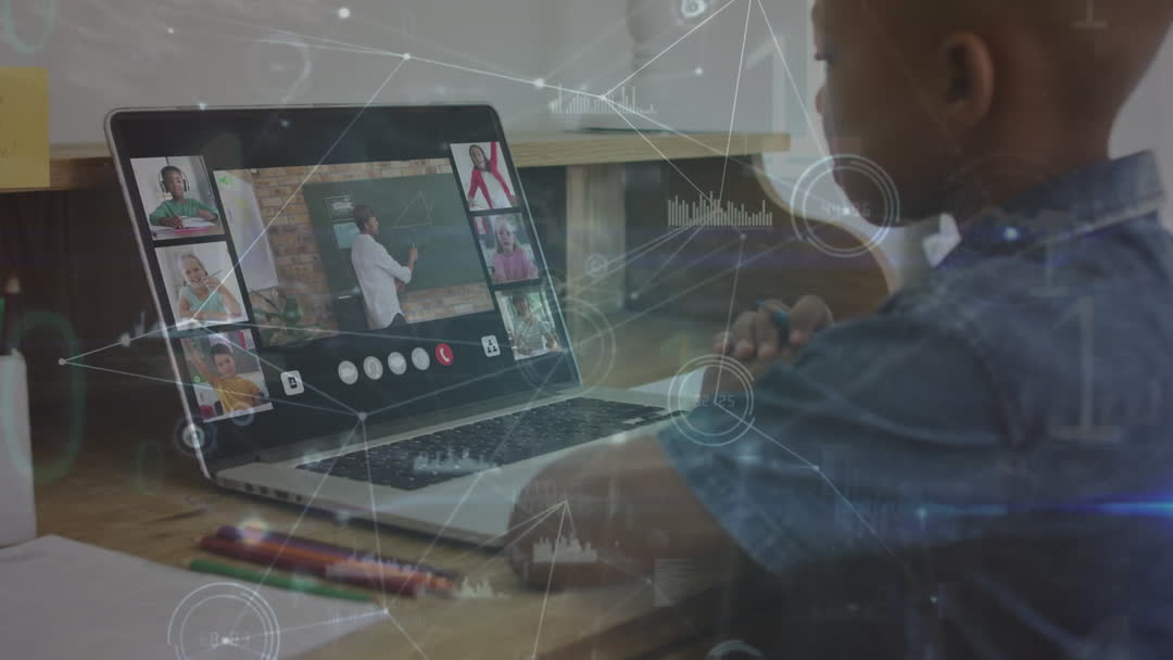 Child Engaging in Online Learning with Technology Interface Overlay Video