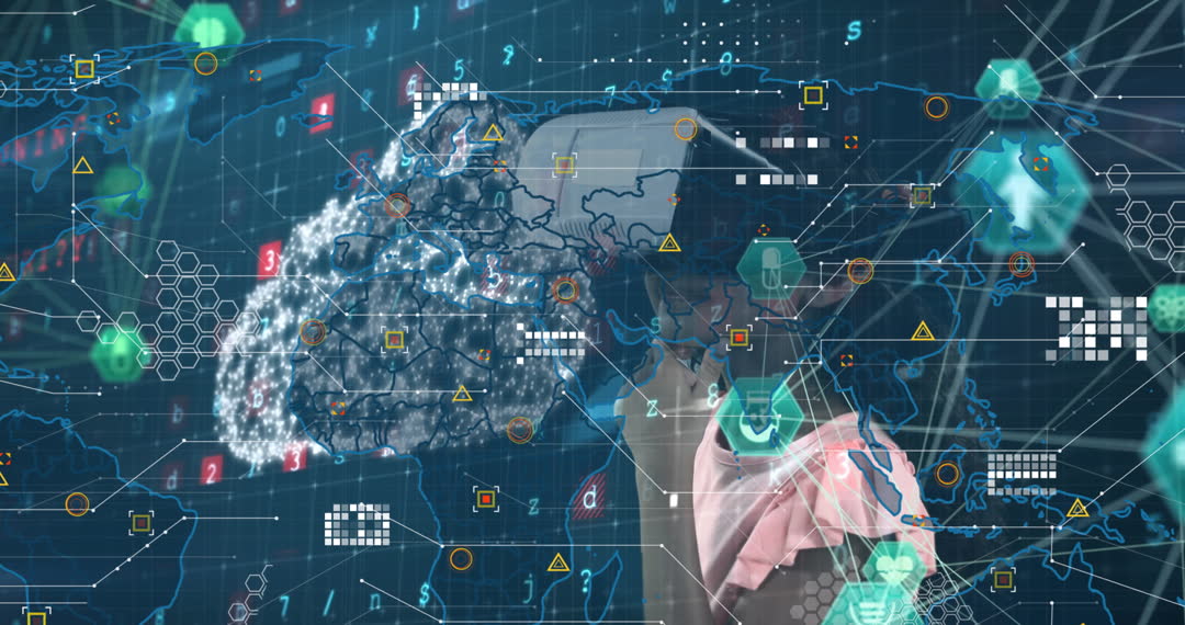 A child using a VR headset is interacting with a digital interface displaying a virtual network map that includes various icons and data elements. This visually represents concepts such as innovation, immersive technology, and cyberspace. Ideal for use in contexts related to technology education, digital learning environments, or illustrating the impact of technology on future generations.