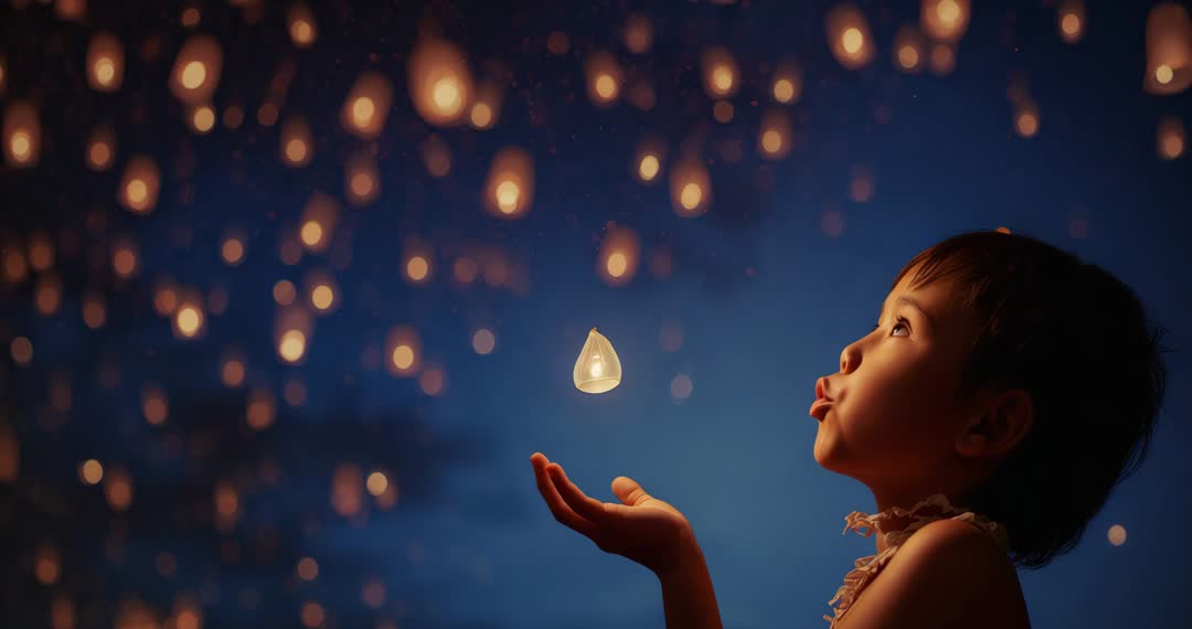- Child Inspiringly Blowing Floating Lantern into Starry Night Sky