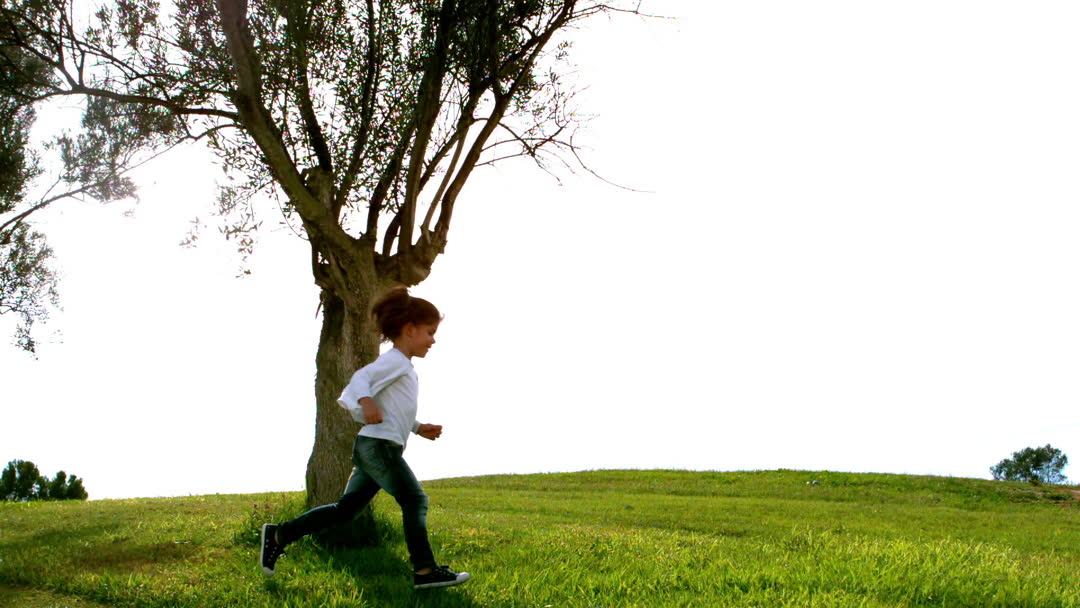 A young child is running energetically beside a tree in a grassy area during a bright day. This scene captures the joy and freedom of childhood play. Ideal for illustrating concepts of refreshing outdoor activity, promoting children's health or exploring nature. Suitable for use in advertisements, childhood development articles, and family-oriented content.